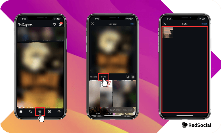 - Find Drafts — Tap the “+” icon as if you’re creating a new post, then look for “Drafts” right below “Recents.”