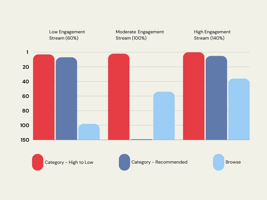 The High Engagement Kick Stream (140%) achieved the highest ranking at #36, followed by the Moderate Engagement Kick Stream (100%) at #54 and the Low Engagement Kick Stream (60%) trailing at #98. This result highlights that higher view percentages are essential for achieving visibility on the broader Browse screen, where only high engagement appears to translate to substantial rank increases.