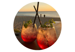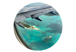 Look: Sunsets, palm trees, waves, tropical colors, airplane icons.