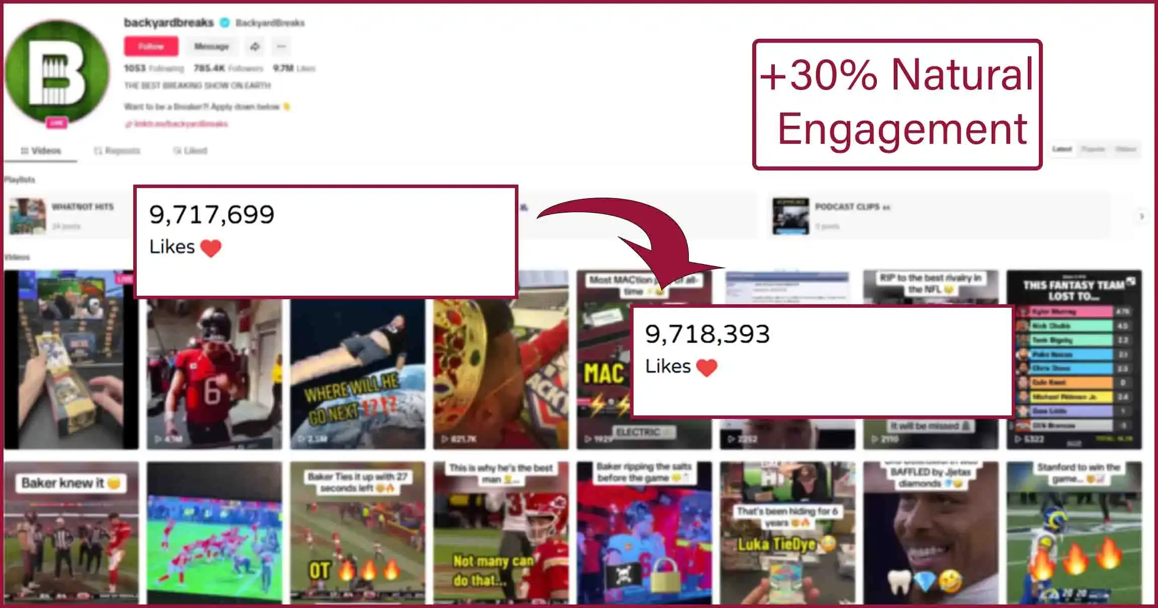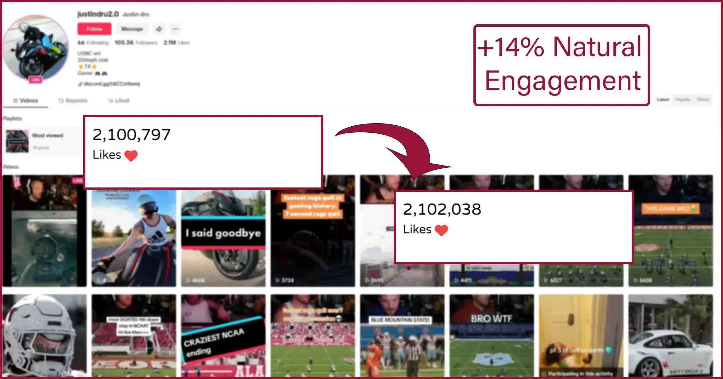 All of the TikTok Lives showed similar increases in organic (natural) viewers. On average, their organic views went up by 32%, thanks to the added Live Views, which means that any boost in Live Views can help a stream get noticed by more people. In other words, the more Live Views you add, the more likely TikTok’s algorithm is to recommend the stream to new viewers. For example, the Exceptional Engagement TikTok Live got a 32% increase, equal to about ~268 extra viewers, while the Moderate Engagement TikTok Live saw a 34% increase, which worked out to around ~173 organic viewers.