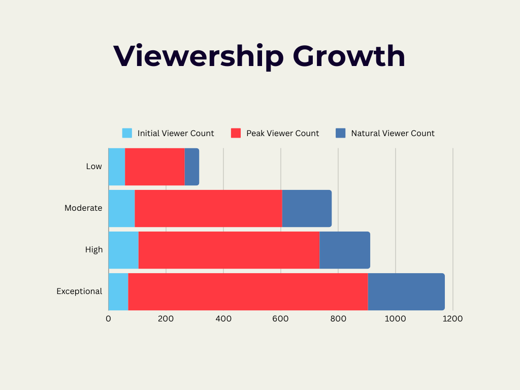 The Moderate Engagement TikTok Live stream began with 91 viewers and, after receiving 250 Live Views, peaked at 514 live viewers. This represents a 465% growth in total viewership over the initial count, with 34% (173 viewers) of that growth coming organically, already demonstrating a consistency on natural growth to Live Views received.