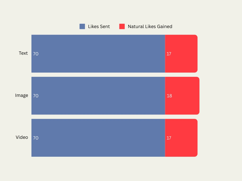 In this scenario, we aimed to determine whether the type of post (text-only, image, or video) affects how much natural engagement it generates when boosted with the same amount of engagement. To keep the test fair, each post received 70 likes, 30 retweets, and 250 views/impressions, regardless of its type.