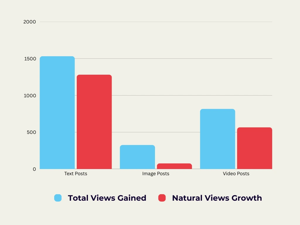 Both image and video posts saw significantly less view growth than text posts (505.8%), though videos outperformed images in this regard, averaging 220% growth in views compared to 28.4% for images. Despite this disparity, both post types still demonstrated notable improvements in natural growth.