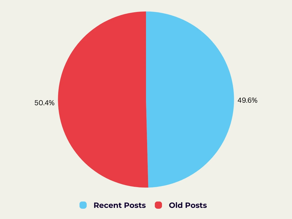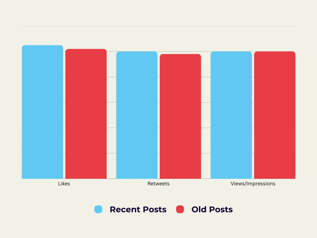 Despite older posts excelling in views, recent posts matched or slightly exceeded older posts in natural like and retweet growth. For example, Recent Post #2 saw a 24% increase in likes and 20% in retweets, on par with Old Post #1‘s growth in these metrics.